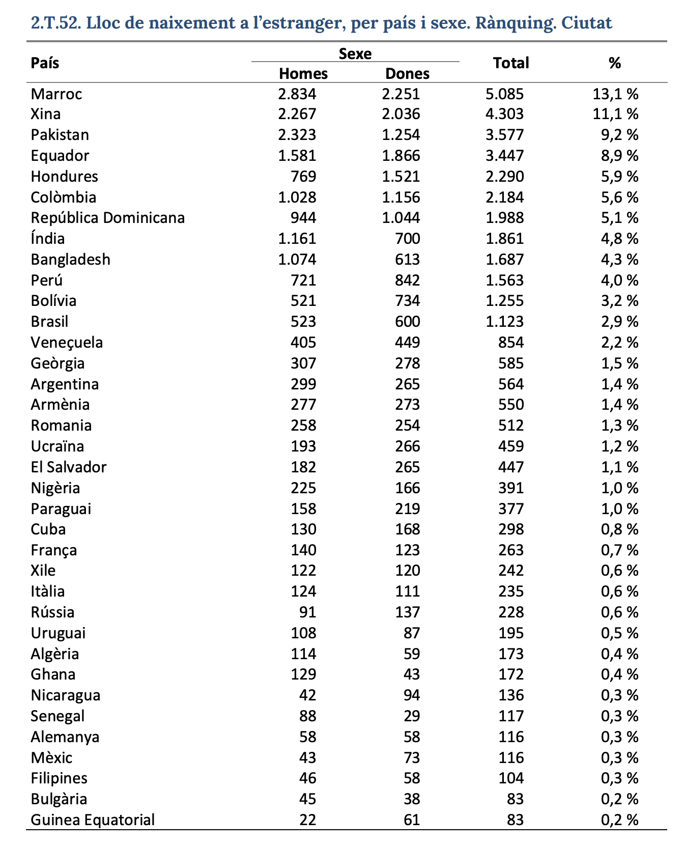 "Població nascuda a l'estranger al barri del Fondo, classificada pel lloc de naixement a l'estranger, per país i sexe. Rànquing. Districte VI." Anuari de Santa Coloma de Gramenet 2021.