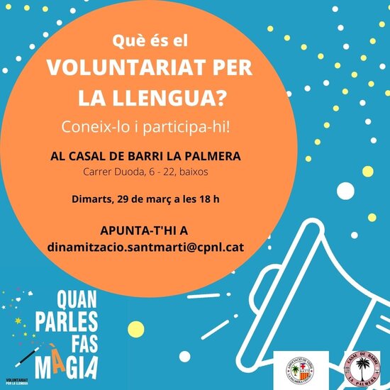 Presentació del programa per a tohom qui el vulgui conèixer i sessió de benvinguda per a persones que volen començar a participar com a voluntàries o com a aprenents al programa Voluntariat per la llengua. Es farà presencialment al Casal de Barri La Palmera.