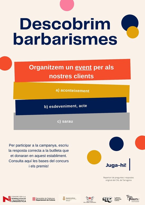 «Descobrim barbarismes» és una campanya que es farà a la Bisbal entre dia 1 de març i el 19 d'abril, que convida la gent a descobrir un error amagat en una frase i a buscar-ne la solució correcta. Es repartiran cartells pels diferents establiments comercials de la Bisbal que formen part de l'associació de comerciants Els Petits Plaers i, acabat el termini, se sortejaran tres premis entre les persones que hi hagin participat, gentilesa de la mateixa associació.