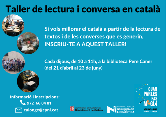 L'Oficina de Català de Calonge organitza un taller de lectura de textos i de conversa en català cada dijous, de 10 a 11 h, del 21 d'abril al 23 de juny. Aquesta activitat s'emmarca dins del programa Voluntariat per la llengua i es du a terme a la Biblioteca Pere Caner de Calonge. S'adreça a persones que vulguin millorar el català a partir de la lectura de textos i de les converses que es generin. Per a més informació i inscripcions: Oficina de Català de Calonge: 972 66 04 81 - calonge@cpnl.cat