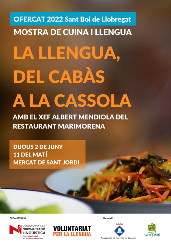 La mostra de cuina i llengua “La llengua, del cabàs a la cassola” té dos objectius, d’una banda fomentar l’ús de la llengua catalana en el comerç i la restauració local en el marc del Pla Ofercat 2022; i de l’altra, oferir una activitat lúdica en català per a l’alumnat del SLC de Sant Boi de Llobregat, per als participants al Voluntariat per la llengua i per als compradors del mercat.