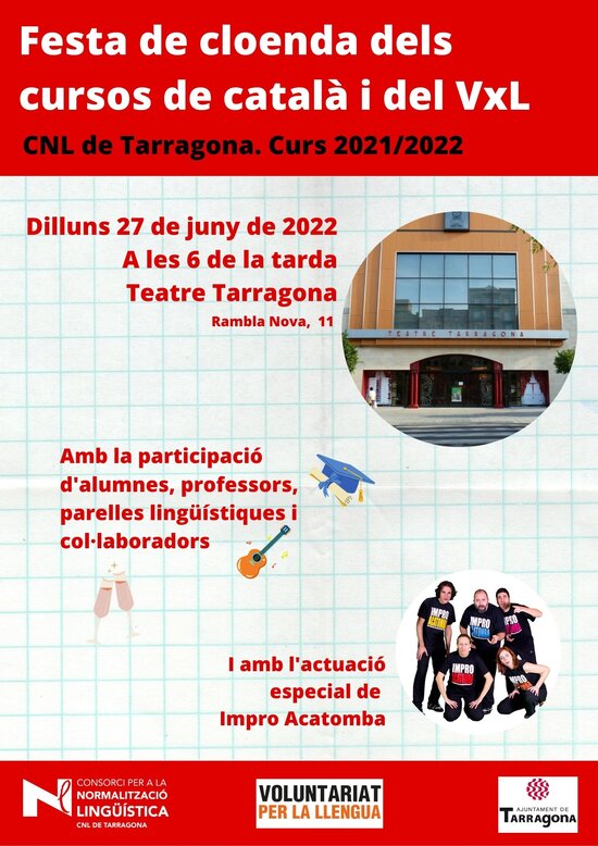 Acte de cloenda dels cursos de català del CNL de Tarragona i de les diferents edicions del Voluntariat per la Llengua. Mostra de tasques del curs i actuació de la companya especialista en improvisacions Impro Acatomba.