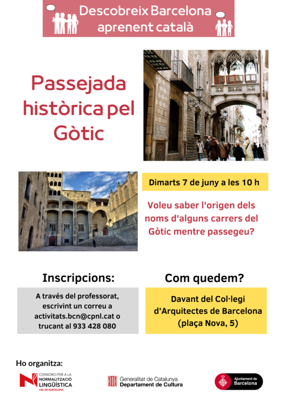 El proper 7 de juny a les 10 h farem un recorregut pel Gòtic, en què descobrirem l’origen d’alguns dels noms dels carrers del barri mentre hi passegem. Ens trobarem davant del Col·legi d’Arquitectes de Catalunya (plaça Nova, 5).