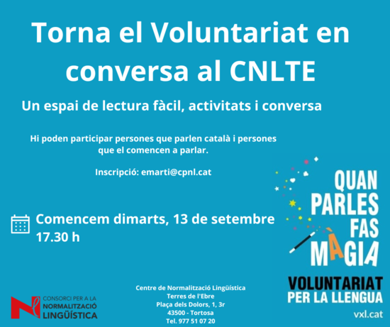 Dimarts 13 de setembre, a les 17.30 h, torna el Voluntariat en conversa. Un espai de lectura fàcil, activitats i conversa adreçat a persones que parlen català i persones que el comencen a parlar.