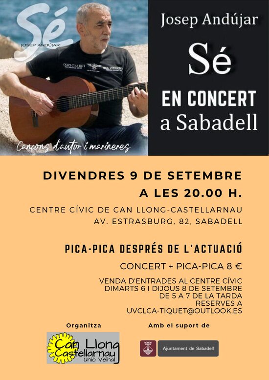 Concert del cantautor Josep Andújar i piscolabis posterior. Cal treure les entrades, a un preu de 8 €, al mateix centre cívic. Activitat organitzada per la Unió Veïnal de Can Llong-Castellarnau.