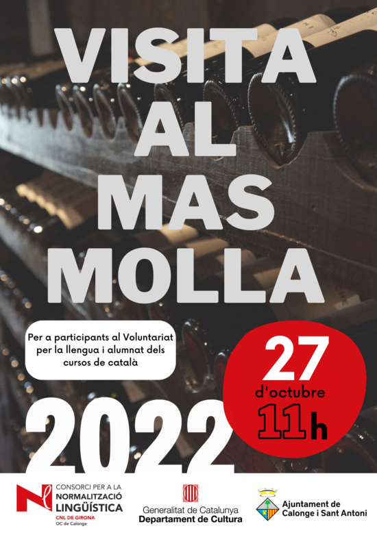 El dijous, 27 d'octubre, a les 11 h, l'alumnat dels cursos de català per a adults i les parelles lingüístiques del municipi faran una visita guiada al mas Molla. Tindran l'oportunitat de familiaritzar-se amb el procés d'elaboració del vi, visitaran el celler i llegiran alguns textos breus relacionats amb el vi. La sortida acabarà amb un tast de vins blancs i negres.