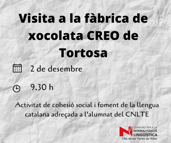 Divendres 2 de desembre, es realitza una sortida cultural a la fàbrica de xocolata CREO de Tortosa. Es tracta d'una activitat de cohesió social i foment de la llengua catalana adreçada a l'alumnat del CNLTE.