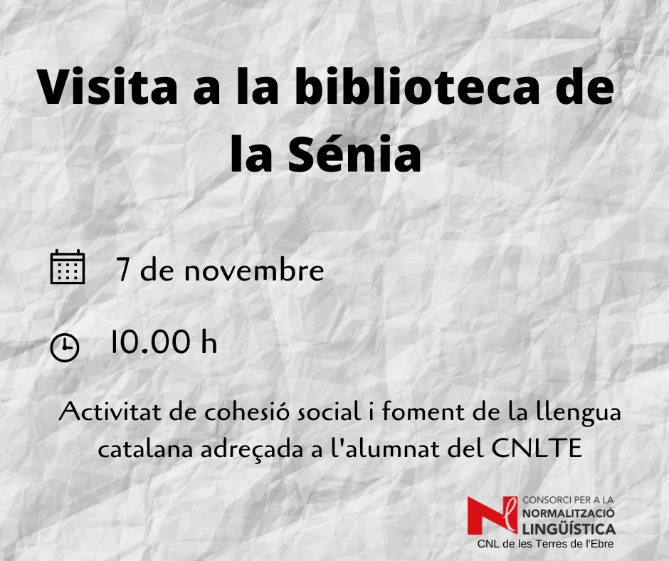 Dilluns 7 de novembre, es realitza una sortida cultural a la biblioteca de la Sénia. Es tracta d'una activitat de cohesió social i foment de la llengua catalana adreçada a l'alumnat del CNLTE.