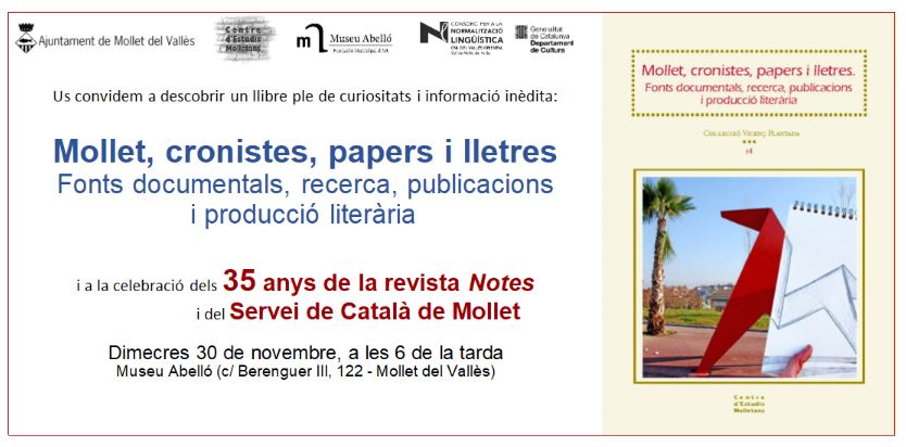 Us esperem a l’acte de presentació del volum 14 de la Col·lecció Vicenç Plantada Mollet, cronistes, papers i lletres. Fonts documentals, recerca, publicacions i producció literària i a la celebració conjunta del 35è aniversari de la revista Notes i del Servei Local de Català de Mollet que tindrà lloc al Museu Abelló.