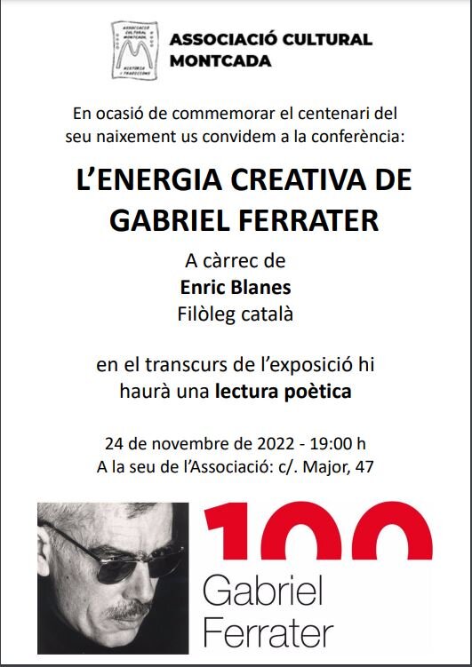 El dijous 24 de novembre a les 19 h, el filòleg Enric Blanes farà la xerrada L’energia creativa de Gabriel Ferrater a l’Associació Cultural Montcada amb motiu del centenari del naixement del poeta.