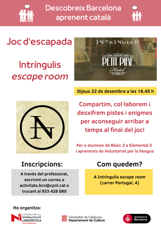 Compartim, col·laborem i desxifrem pistes i enigmes per aconseguir arribar a temps al final del joc! Activitat dirigida a alumnes de Bàsic 2 a Elemental 3 i aprenents de Voluntariat per la llengua.