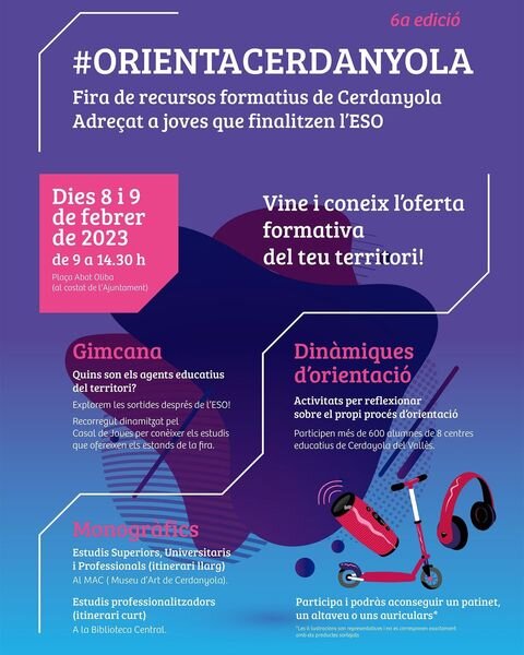 El Servei Local de Català participarà en l’edició de la Fira Orienta Cerdanyola els dies 8 i 9 de febrer, de 9 a 14 h. La fira, organitzada per les regidories de Joventut i Educació de l’Ajuntament de Cerdanyola, va adreçada als estudiants de 4t d’ESO, als quals se’ls informa de les diverses opcions formatives que tenen a la ciutat.