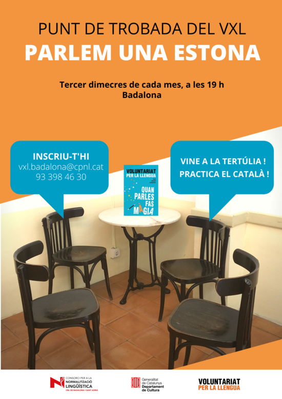 “Parlem una estona” és una activitat del CNL de Badalona i Sant Adrià amb l'objectiu de potenciar l'ús social de la llengua catalana, especialment per a aquelles persones que volen millorar la seva expressió oral en català i per a les parelles lingüístiques.