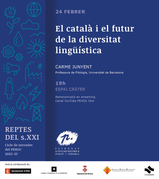 Xerrada de Carme Junyent, inclosa dins el cicle del Patronat d'Estudis Històrics d'Olot i Comarca (PEHOC) "Reptes del segle XXI" i organitzada pel Servei de Català. Serà emesa per streaming perquè pugui ser seguida per molta més gent.