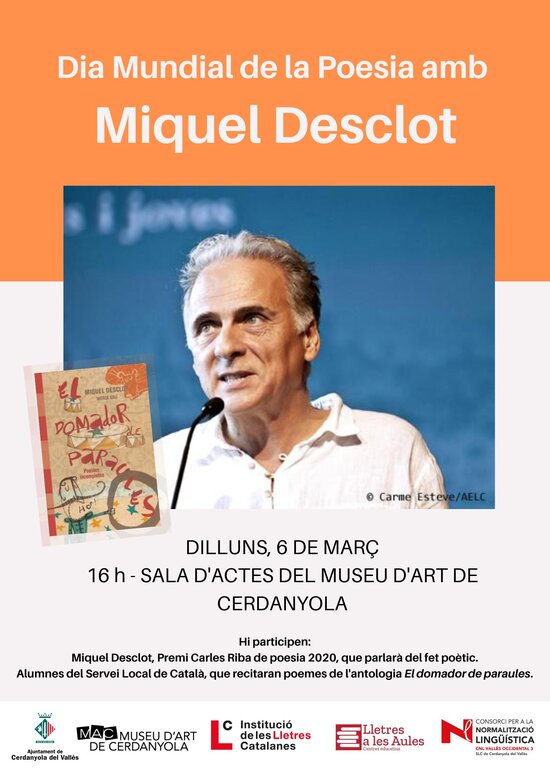 El proper 6 de març, a les 16 h, el poeta Miquel Desclot oferirà un recital a la Sala d’actes del Museu d’Art de Cerdanyola amb motiu del Dia Mundial de la Poesia, que es commemora cada any el 21 de març.