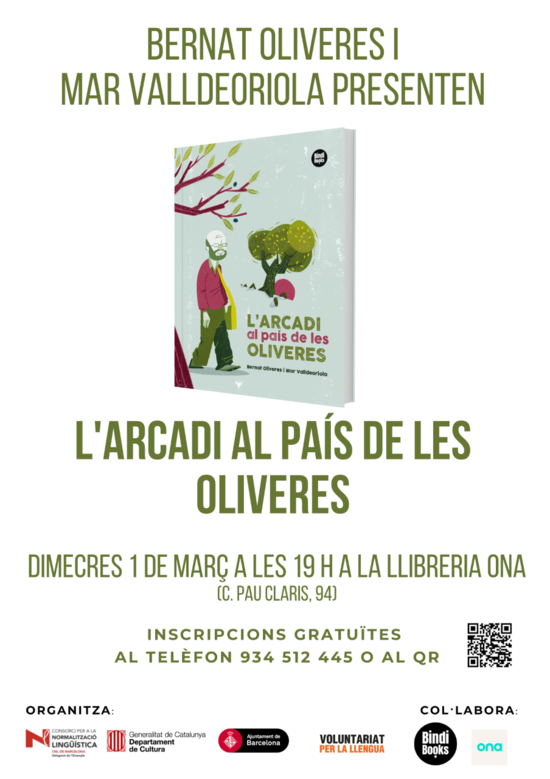 El dimecres 1 de març a les 19 h a la llibreria Ona (Pau Claris, 94), els autors Bernat Oliveres i Mar Valldeoriola presentaran el seu últim llibre "L'Arcadi al país de les oliveres" on s'exposen les principals idees d'Arcadi Oliveres, de la mà de les il·lustracions del seu propi fill i del text de Valldeoriola.