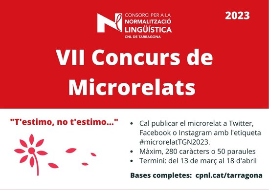 La setena edició del Concurs de Microrelats "T'estimo, no t'estimo..." s'adreça a alumnes i exalumnes de català del CNL de Tarragona (CNLT), a participants del programa Voluntariat per la Llengua i a seguidors de les xarxes socials del CNLT. És precisament a les xarxes Twitter, Facebook i Instagram on s'han de publicar els microrelats, que han de ser en català i tenir una llargada màxima de 280 caràcters o 50 paraules. Cal acompanyar-los amb l'etiqueta #microrelatTGN2023. El tema sobre el qual ha de girar el microrelat és l'amor i el desamor, en qualsevol de les seves múltiples manifestacions.