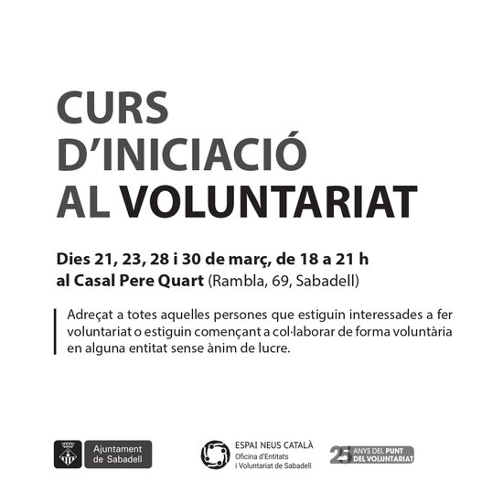 En el marc del Curs d'Iniciació al Voluntariat, organitzat per l'Oficina d'Entitats i Voluntariat de l'Ajuntament de Sabadell, tindrà lloc la Taula rodona d'experiències de voluntariat per part de diverses entitats, que inclourà el testimoni d'una parella lingüística.