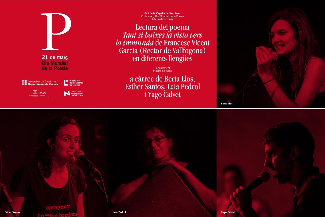 La UNESCO va proclamar el dia 21 de març com el Dia Mundial de la Poesia. Per celebrar-lo, la Institució de les Lletres Catalanes ha escollit el poema "Tant si baixes la vista vers la immunda", de Francesc Vicent Garcia (Rector de Vallfogona), que s'ha traduït a una vintena de llengües del món, perquè sigui llegit arreu de Catalunya.