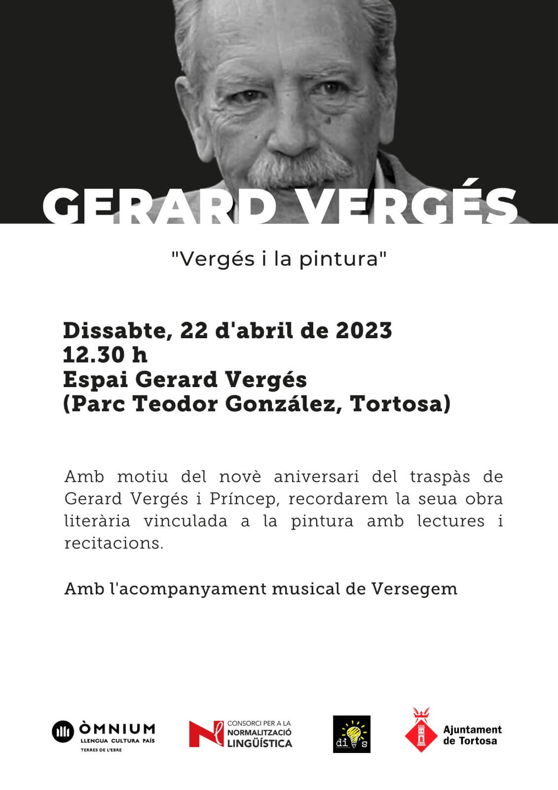 El dia 22 d'abril, a les 12.30 h, al Parc Municipal de Tortosa, hi ha un acte de commemoració amb motiu del novè aniversari del traspàs de l'escriptor Gerard Vergés i Príncep amb lectura de textos de l’autor vinculats a l'art pictòric i acompanyament musical de Versegem.