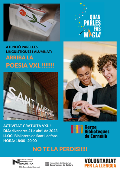 El Voluntariat per la llengua celebra la diada de Sant Jordi amb l'activitat Poesia VxL a la Biblioteca Sant Ildefons, on s'inaugurarà oficialment el nou Punt de trobada VxL. Tot seguit, tindrà lloc un recital de poesia a càrrec de les parelles lingüístiques, acompanyades dels poetes locals guardonats i voluntaris del VxL Francesc-Xavier Simarro i Toni Alcalà.