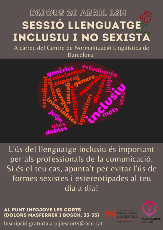 Sessió de llenguatge inclusiu i no sexista. Es farà al Punt InfoJove les Corts el proper 20 d’abril a les 18 hores. A càrrec de la Delegació de les Corts del CNL de Barcelona.