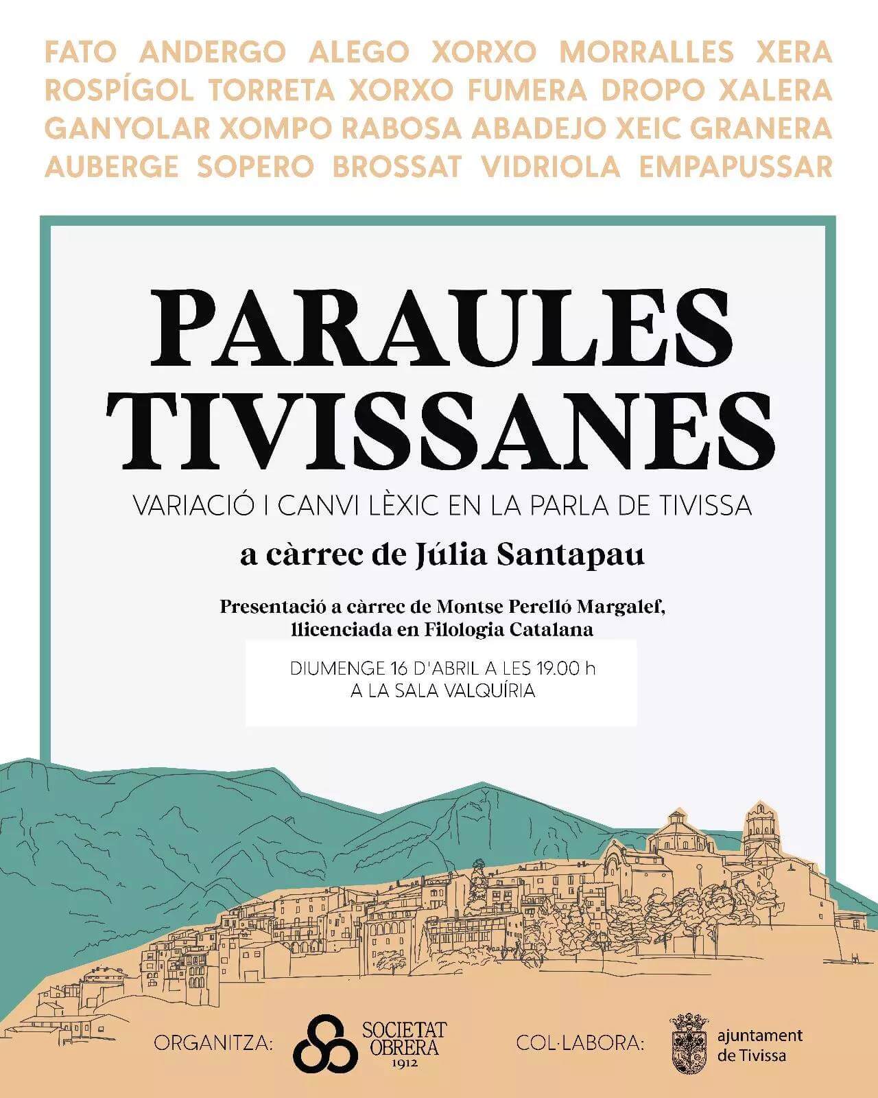 Diumenge 16 d'abril, a les 19.00 h, a la Societat Obrera de Tivissa, hi ha una conferència sobre les paraules d'aquesta població de la Ribera d'Ebre. L'acte anirà a càrrec de Júlia Santapau i serà presentat per Montse Perelló.