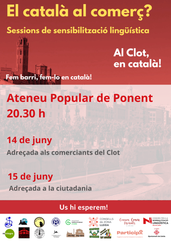 Sessions de sensibilització lingüística adreçades als comerciants del barri del Clot de les Granotes, el dia 14, i als veïns del barri, el dia 15, en el marc de la campanya de foment de l’ús del català “Al Clot, en català!”.