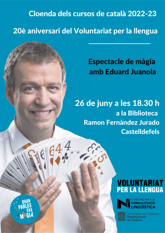 El dilluns 26 de juny se celebrarà la cloenda dels cursos de català del Servei Local de Català de Castelldefels i el 20è aniversari del Voluntariat per la llengua. Durant l'acte els assistents gaudiran d'un espectacle de màgia a càrrec del mag Eduard Juanola.
