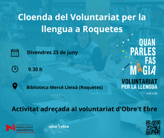 Divendres 23 de juny, a les 9.30 h, a la Biblioteca Mercè Lleixà de Roquetes se celebra un acte de cloenda i reconeixement a les persones participants al programa Voluntariat per la llengua que estan vinculades a l’associació Obre’t Ebre de Roquetes.