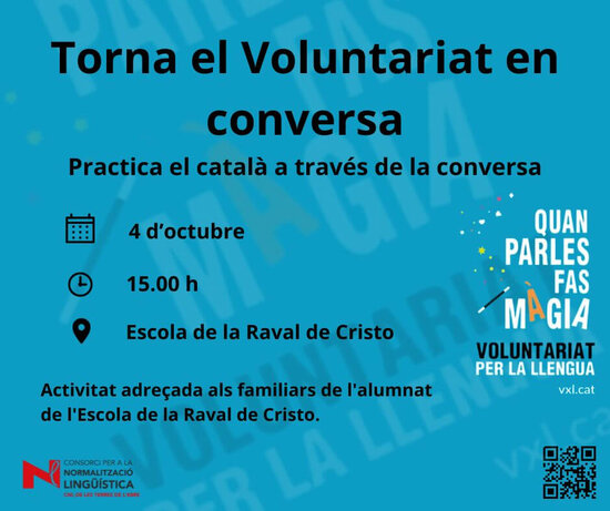 Dins de les activitats per promoure el Voluntariat per la llengua, els dimecres laborables a les 15.00 h, es realitzarà un taller de conversa amb familiars de l'alumnat de l'Escola de la Raval de Cristo.