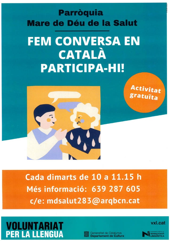 Aquest mes d'octubre, la Parròquia Mare de Déu de la Salut engega novament un grup de conversa per a veïns del barri interessats a millorar el català oral. El grup, conduït per persones voluntàries, es reunirà setmanalment cada dimarts de 10 a 11 del matí.