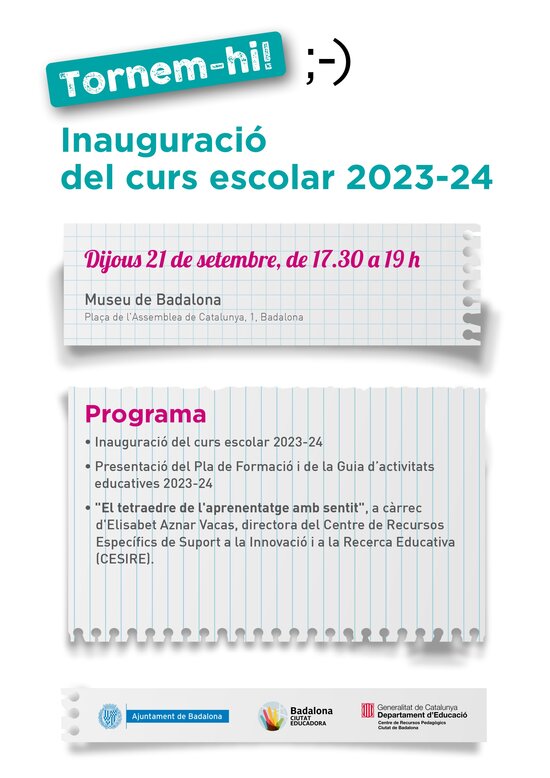 El dijous 21 de setembre, de 17.30 a 19 h, tindrà lloc l'acte d'inauguració del curs escolar 2023-24 de Badalona. L'organitza el Servei Educatiu del Departament d'Educació de la Generalitat de Catalunya i el Servei d'Educació de l'Ajuntament de Badalona. Es durà a terme al Museu de Badalona.