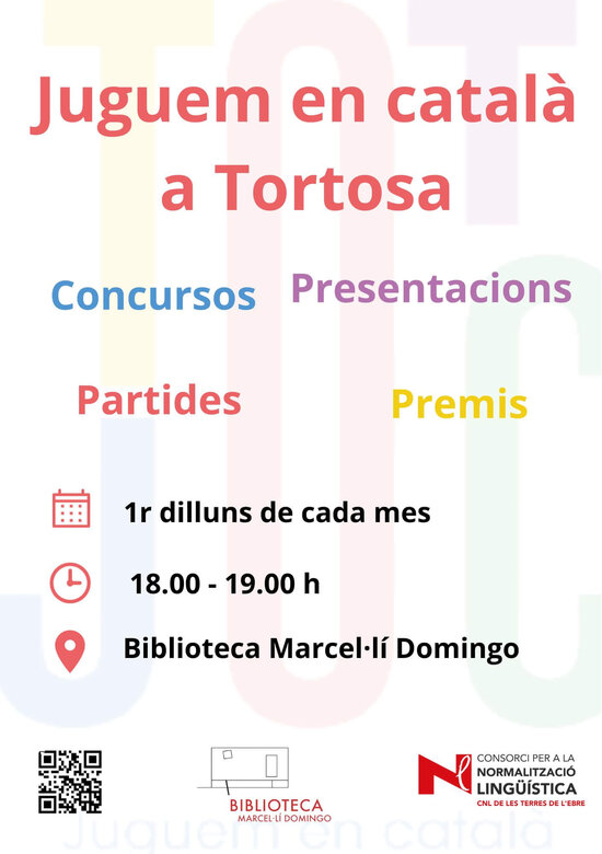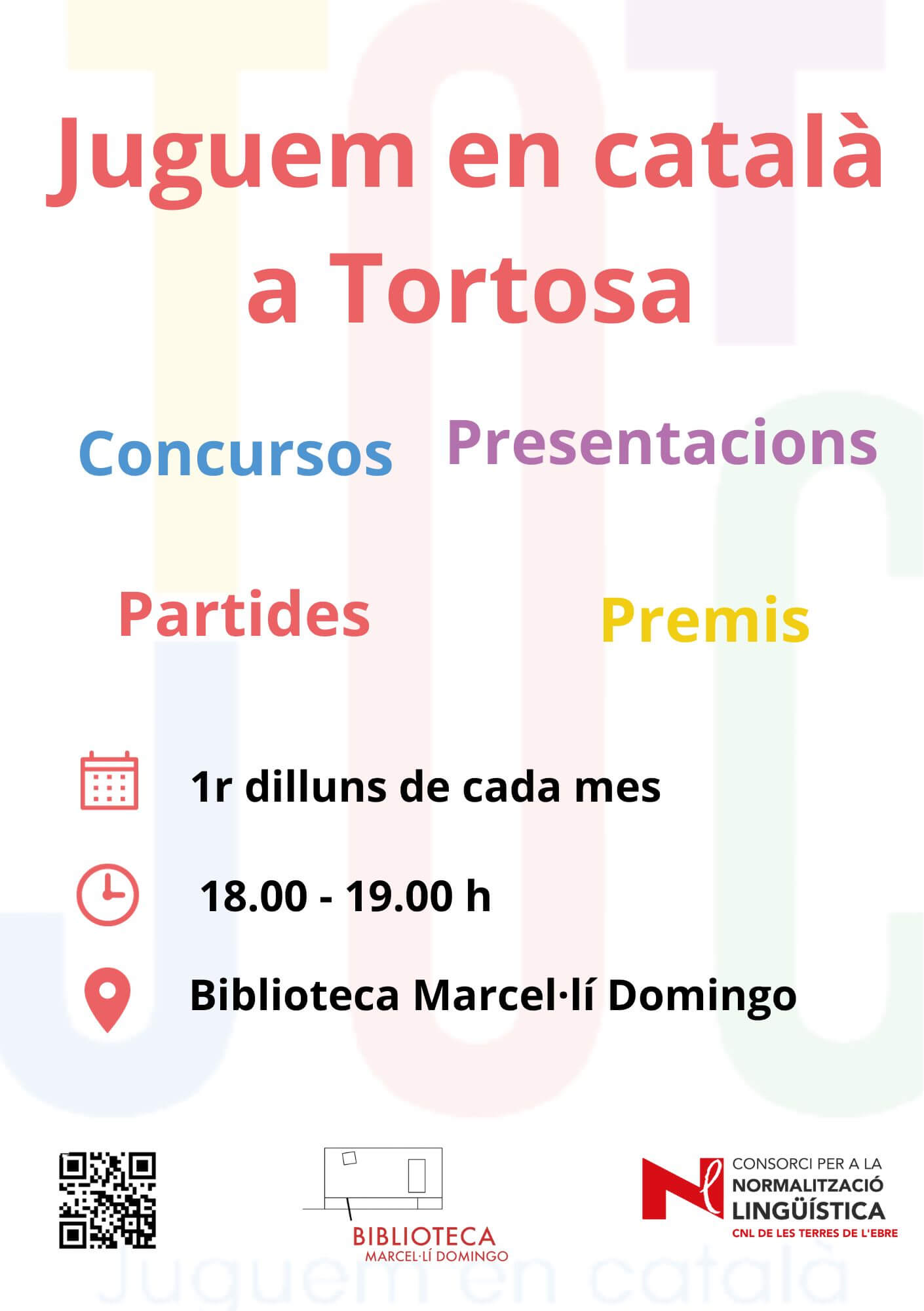 El dilluns dia 2 d'octubre, a les 18.00 h, comença una nova activitat a la Biblioteca Marcel·lí Domingo de Tortosa: Juguem en català a Tortosa.