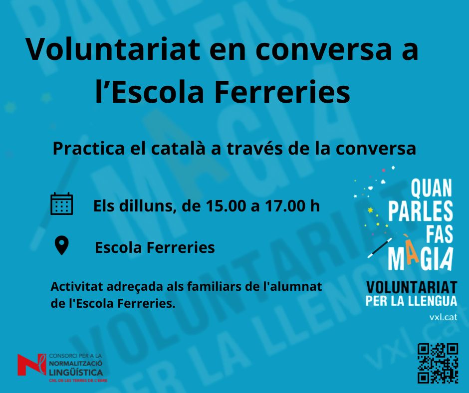 Dins de les activitats per promoure el Voluntariat per la llengua, els dilluns laborables de 15.00 a 17.00 h, es realitzarà un taller de conversa amb familiars de l'alumnat de l'Escola Ferreries.
