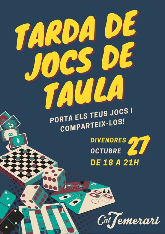 Divendres 27, de 18 a 21 h, porteu els vostres jocs de taula a Cal Temerari i compartiu-los amb la resta d’assistents per passar una vetllada lúdica en bona companyia. Una bona oportunitat per practicar el català fora de l’aula i conèixer altres jocs.