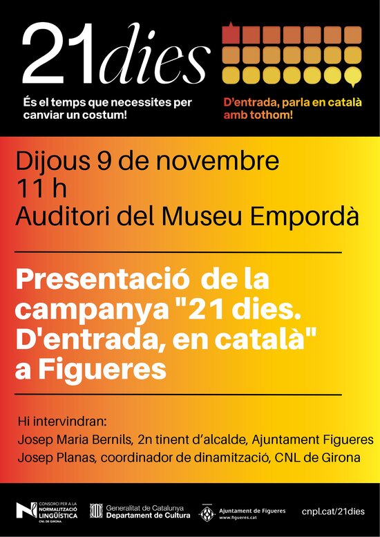 El dijous 9 de novembre, a les 11 h, es presentarà la campanya "21 dies. D'entrada, en català" a la Figueres per tal de conscienciar a la població sobre la importància de no canviar de llengua.