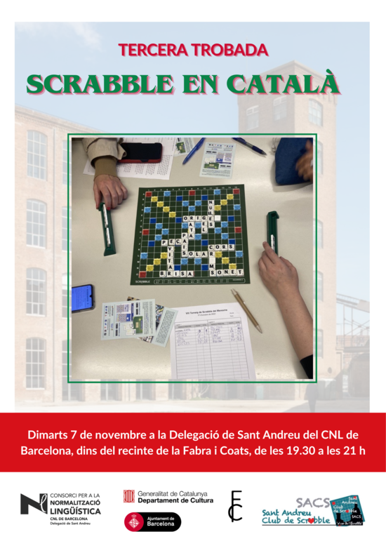 El proper 7 de novembre, de 19.30 a 21 h, jugarem a Scrabble en català a la Delegació de Sant Andreu del CNL de Barcelona. És la tercera trobada que es fa a la delegació.