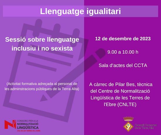 El dia 12 de desembre es realitzarà una sessió de llenguatge inclusiu i no sexista, al Consell Comarcal de la Terra Alta. L'activitat està adreçada al personal de les administracions públiques de la Terra Alta.