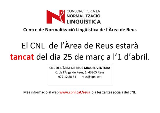 Els CNL de l'Àrea de Reus i tots els seus serveis estaran tancats per vacances de Setmana Santa del 25 de març a l’1 d’abril.