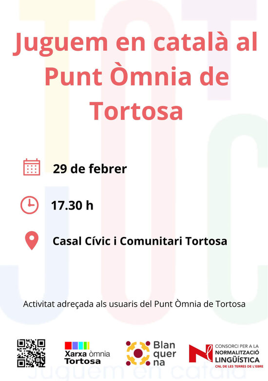 El dijous 29 de febrer, a les 17.30 h, hi haurà una sessió de jocs en català adreçada als usuaris del Punt Òmnia de Tortosa.