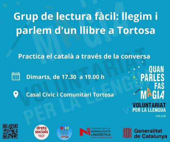 Grup de conversa i de lectura fàcil al Casal Cívic i Comunitari Tortosa. L'activitat està adreçada als familiars dels usuaris del Casal. Es realitzarà els dimarts laborables, de 17.30 a 19.00 h.