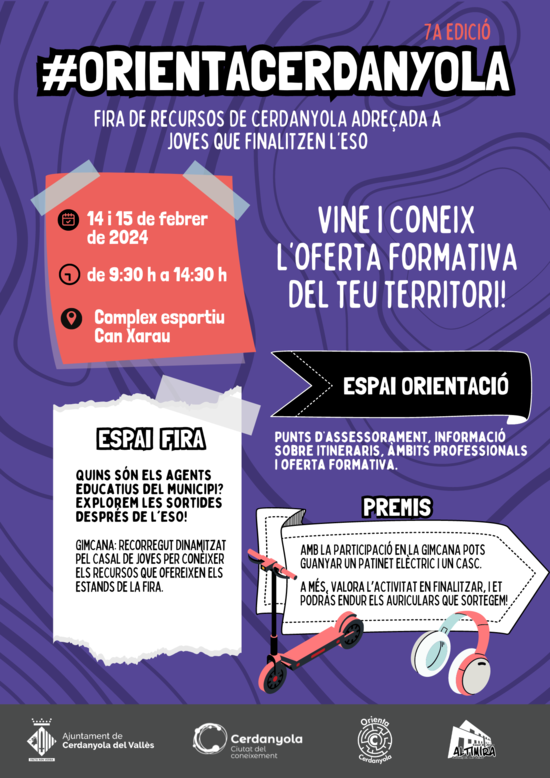 El Servei Local de Català (SLC) participarà en l’edició de la Fira Orienta Cerdanyola els dies 14 i 15 de febrer, de 9.30 a 14 h. La fira, organitzada per les regidories de Joventut i Educació de l’Ajuntament de Cerdanyola, va adreçada als estudiants de 4t d’ESO, als quals se’ls informa de les diverses opcions formatives que tenen a la ciutat.