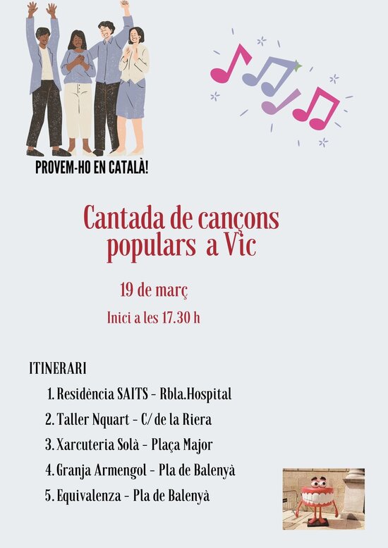 Dimarts, 19 de març, els participants del taller de cançons populars, que va començar el 27 de febrer, cantaran les cançons i corrandes davant d'alguns establiments col·laboradors del programa de VxL de la ciutat.