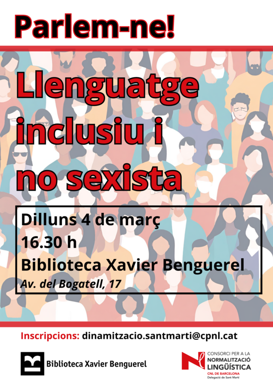 En el marc del 8 de març, Dia de la Dona Treballadora, la Delegació de Sant Martí organitza una Sessió de llenguatge inclusiu i no sexista a la biblioteca Xavier Benguerel el dilluns 4 de març a les 16.30 h. La sessió és oberta a tothom.