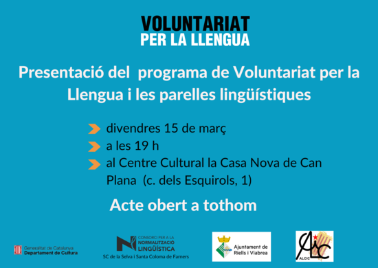 El proper divendres 15 de març, a les 7 de la tarda, el Centre Cultural la Casa Nova de Can Plana acollirà l’acte de presentació del programa de Voluntariat per la llengua a Riells i Viabrea.