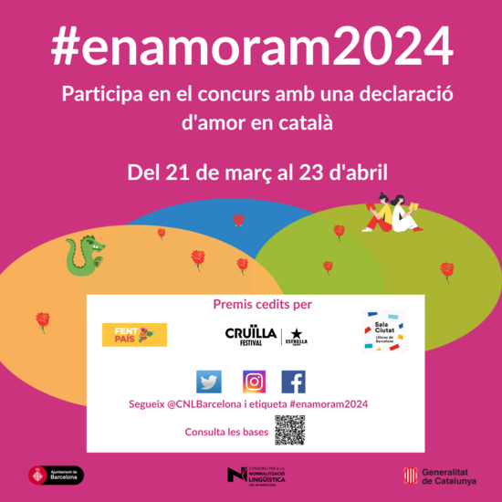 El CNL de Barcelona convida la ciutadania en general i també els seus alumnes a participar al concurs #enamoram2024, que consisteix a elaborar declaracions d'amor en format escrit, de vídeo o d'àudio. El concurs s'iniciarà el 21 de març, amb motiu del Dia Mundial de la Poesia, i finalitzarà el 23 d'abril, per la Diada de Sant Jordi.