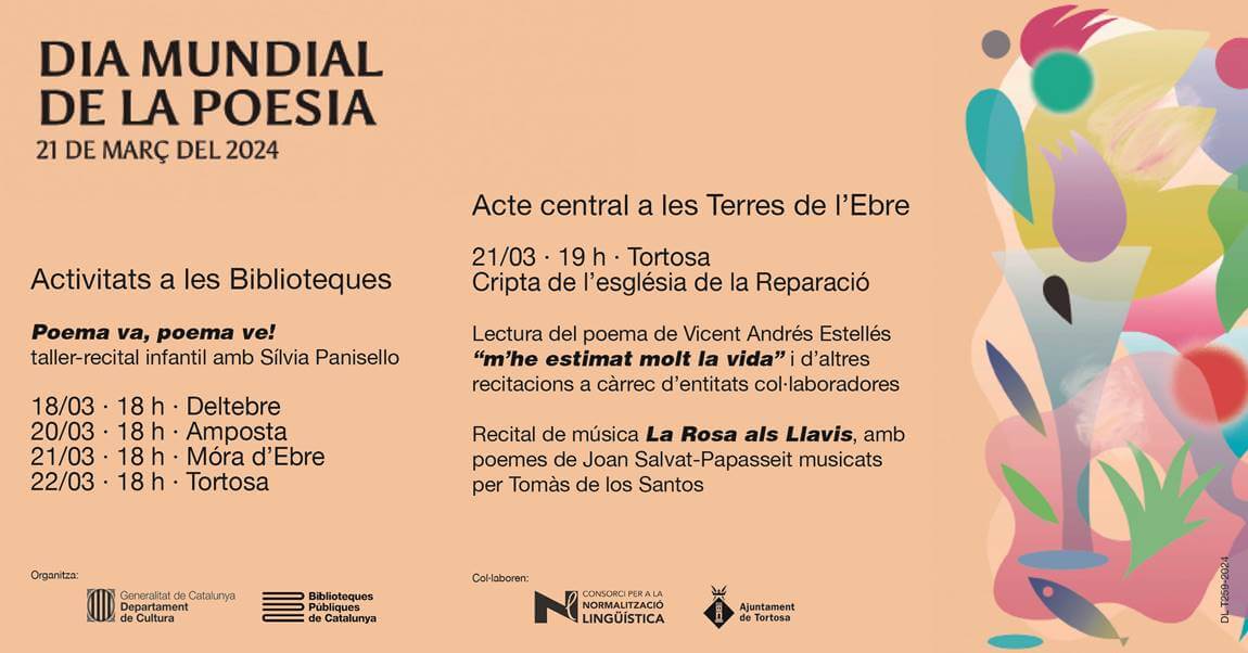 El dia 21 de març, a les 19.00 h, se celebra el Dia Mundial de de la Poesia, a la Cripta de l'església de la Reparació de Tortosa. Hi haurà la lectura del poema 'M'he estimat molt la vida' de V. A. Estellés i l'actuació del cantautor valencià Tomàs de los Santos en el seu homenatge musical a Joan Salvat-Papasseit.