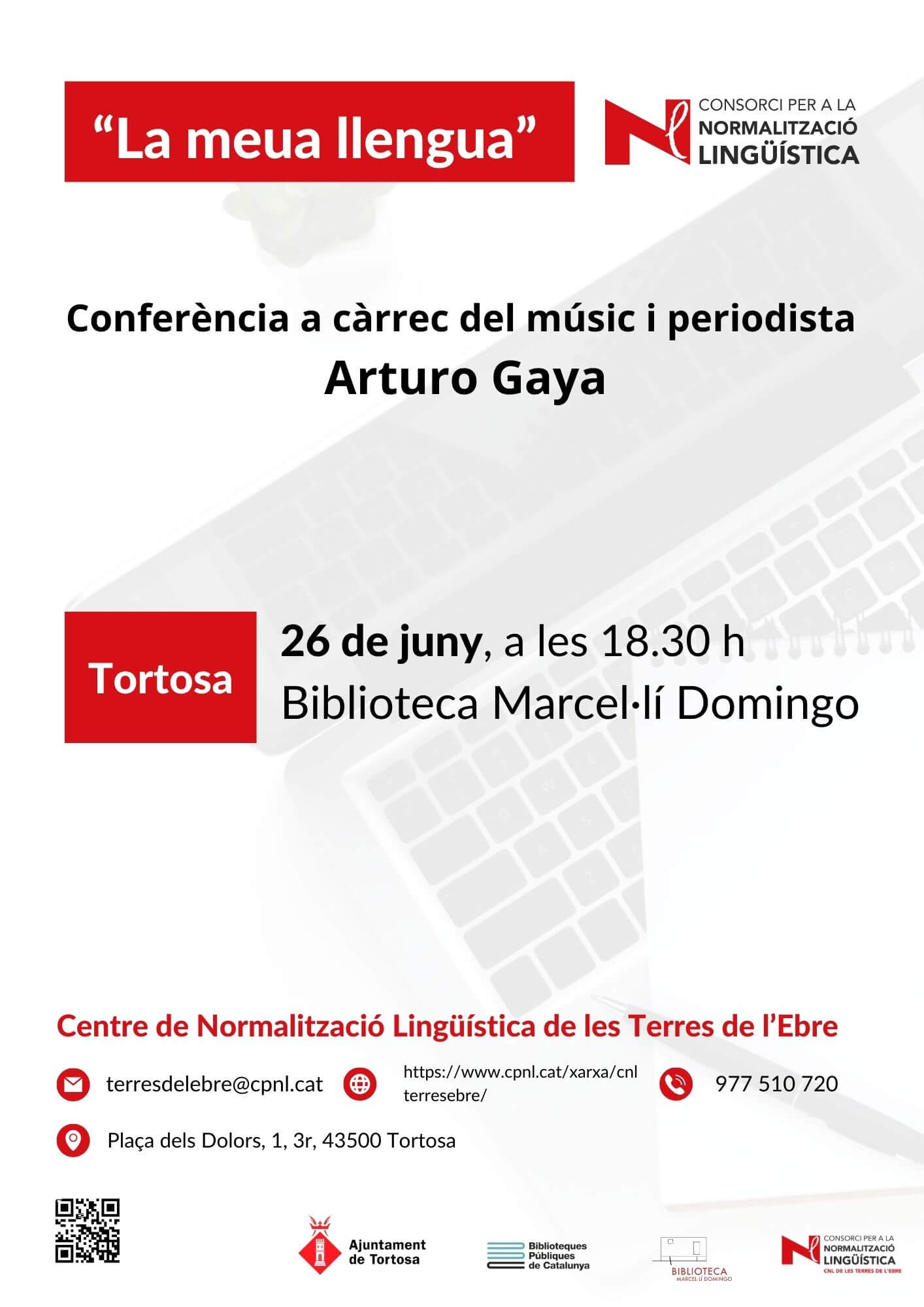 El dia 26 de juny de 2024, a les 18.30 h, tindrà lloc a la Biblioteca Marcel·lí Domingo de Tortosa la conferència "La meua llengua", a càrrec del músic i periodista Arturo Gaya.