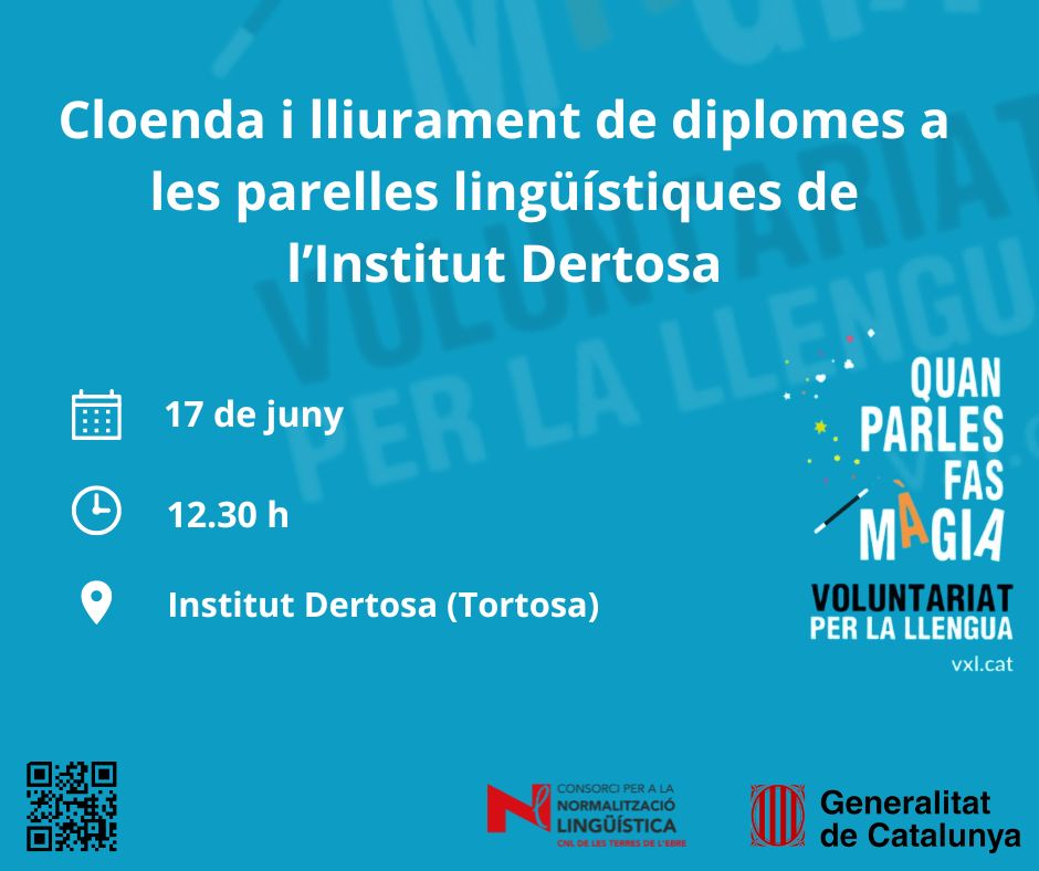El dia 17 de juny, a les 12.30 h, hi ha l'acte de cloenda i lliurament de diplomes del Voluntariat per la llengua, a les parelles lingüístiques de l'Institut Dertosa.